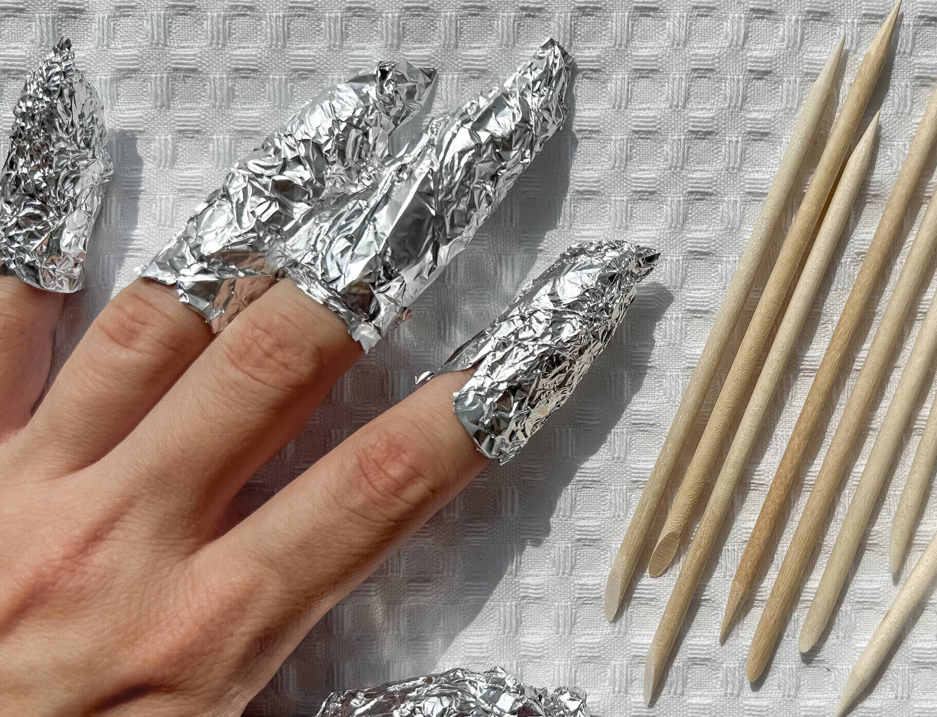 - Tränk ein Wattepad in Aceton, leg es auf den Nagel und wickel es anschließend mit Alufolie ein.